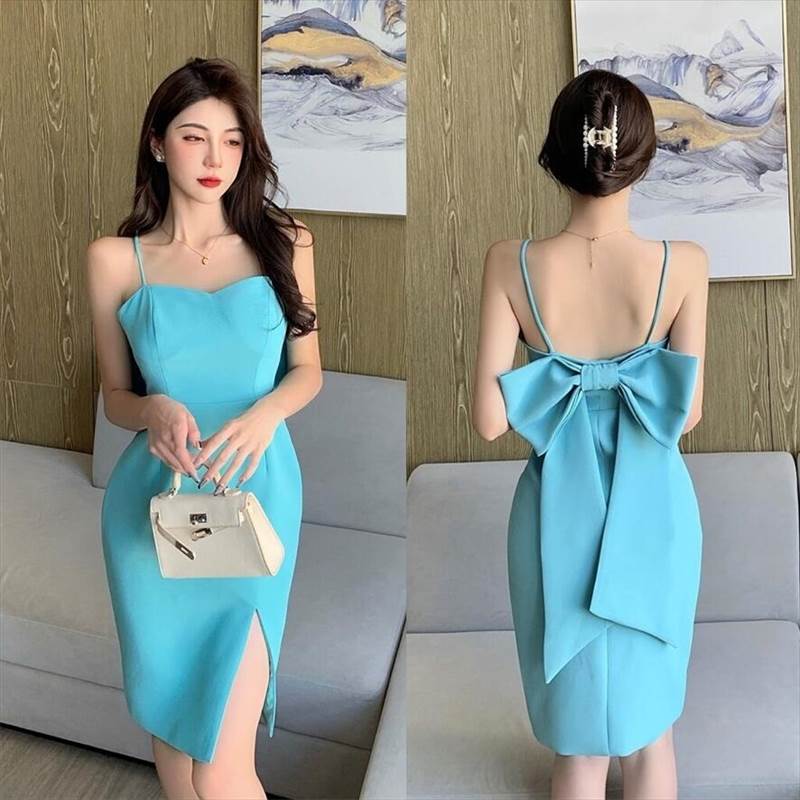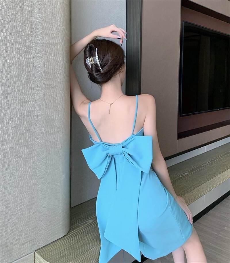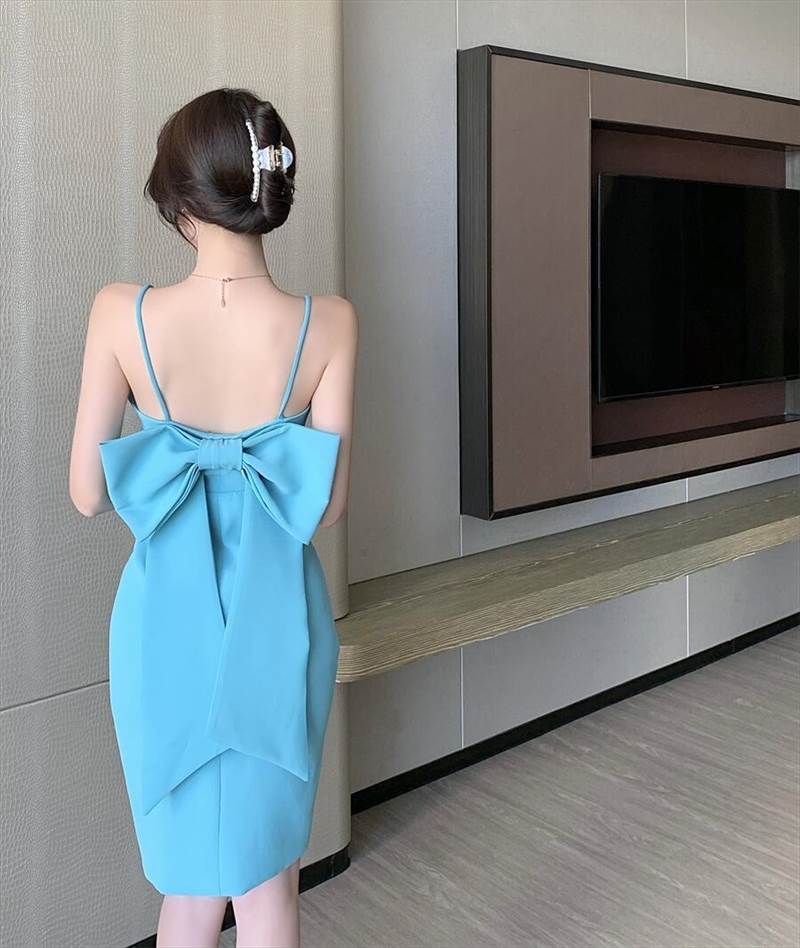 キャバドレス ミニ ひざ丈 ワンピース ドレス レディース キャミ 肩出し バックコンシャス バックリボン ブルー 青 水色 パーティードレス 無地 ミニ丈 スリット タイト キャバ ギャル セクシー