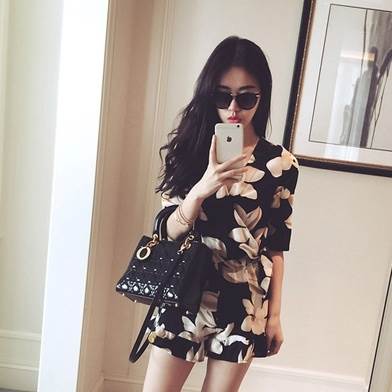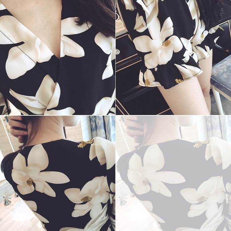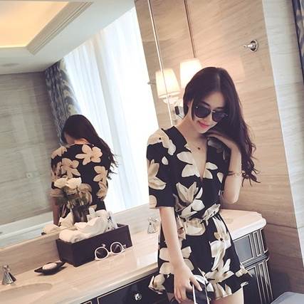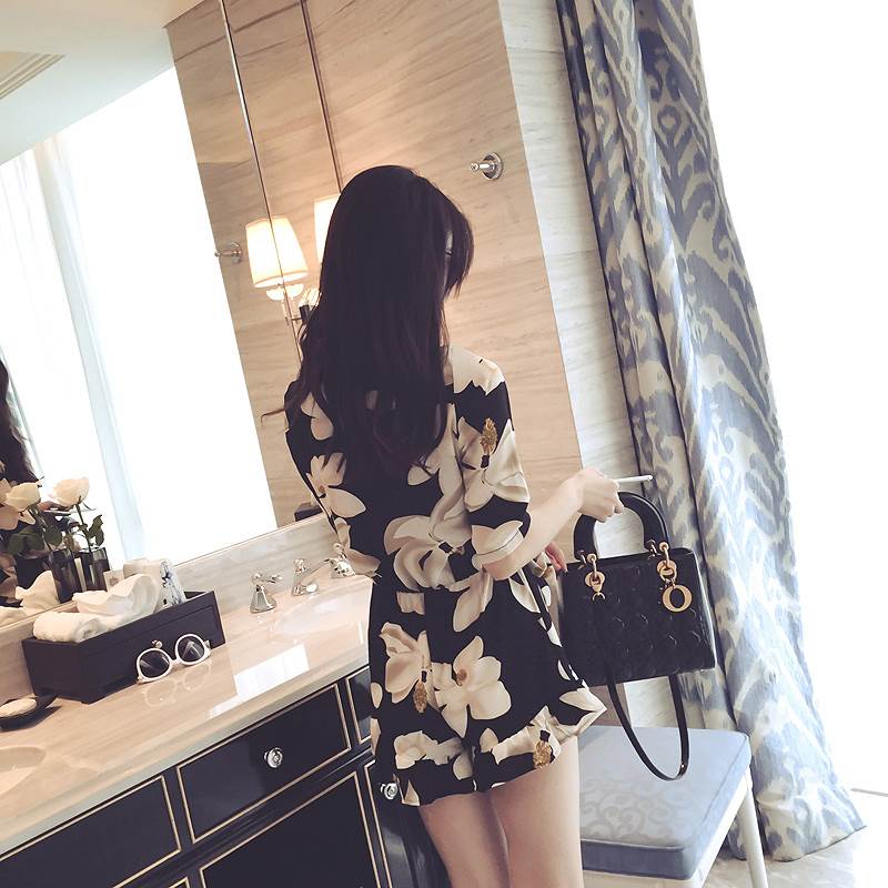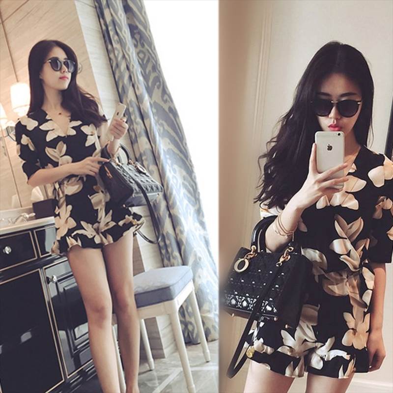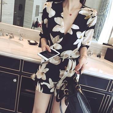オールインワン パンツ 黒 小花柄 ミニ丈 V