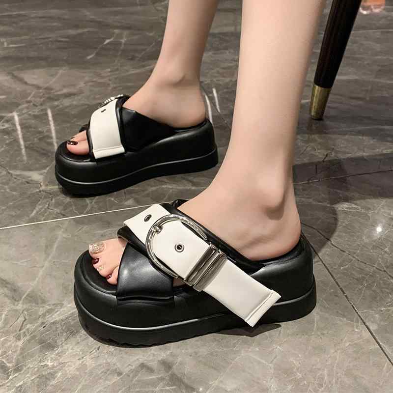 ビーサン 超厚底 ハイヒール スタイルアップ カッコイイ ユニーク ベルト 穴 インスタ映え ブラックコーデ パンク 華やか つっかけ 大学生 ラフ リラックス レザー