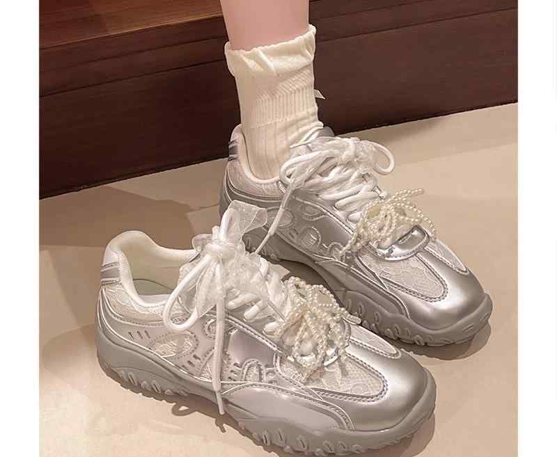 スニーカー レース パール 可愛い 個性的 運動靴 メタリック シルバー 韓国系 レディース おしゃれ レトロ リボン 透け感 ラブリー 白 ホワイト 銀色 ニュアンスカラー 春夏 シューズ ベージュ