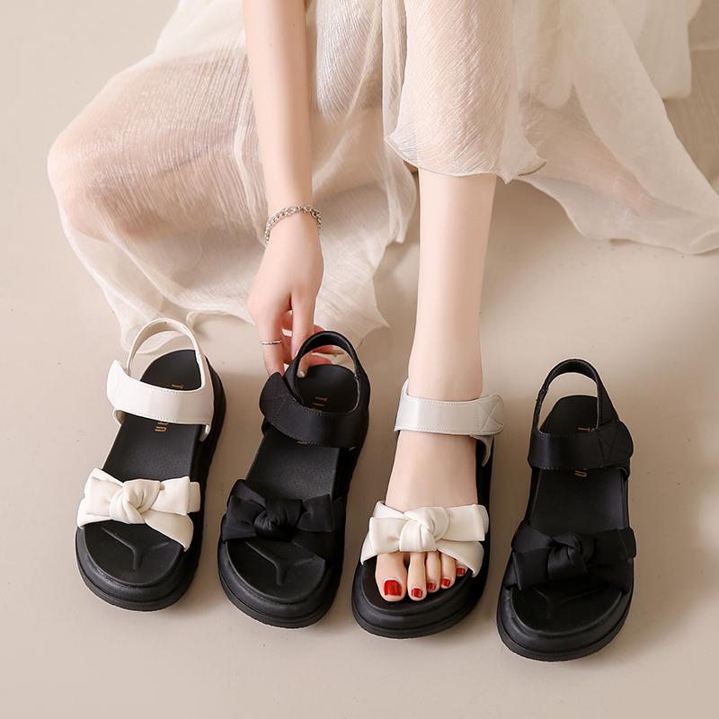 ビーチサンダル 厚底サンダル 黒色 白色 リボン付 量産系 ガーリー オルチャン系 女の子 ソフトレザー キュート ベーシック 合わせやすい キレイ 足首