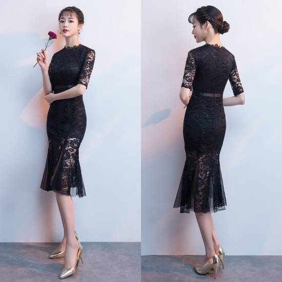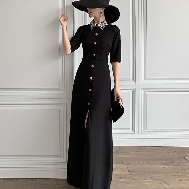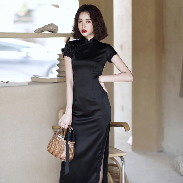 チャイナドレス ロング 黒 大きいサイズ パーティードレス 半袖 ミモレ丈 かっこいい セクシー おしゃれ ロングドレス 演奏会 結婚式 お呼ばれ ドレス タイト スリット クール ワンピース