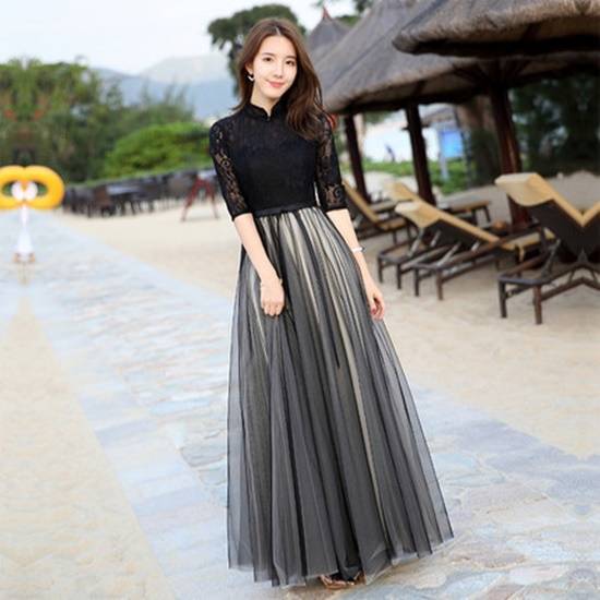 パーティードレス ロング ドレス 演奏会 結婚式 パーティー お呼ばれ 二次会 ロングドレス aライン フォーマルドレス 黒 袖あり スタンドカラー 五分袖 チュール ドッキング 大人可愛い レース