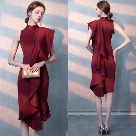 パーティードレス ワンピース ドレス ノースリーブ 膝丈 タイト マーメイド ワンショルダー フリル リボン 無地 シンプル セクシー 黒 白 大人