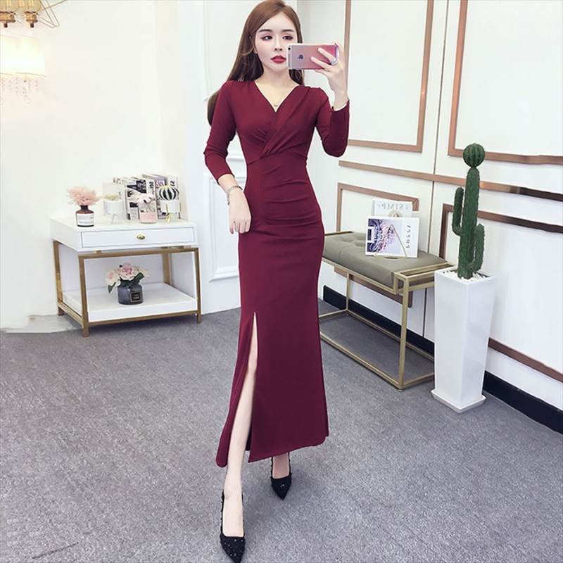 4色 パーティードレス ロング マーメイド スリット キャバ ドレス レディース 長袖 春 夏 秋 タイト 露出 黒 無地 Vネック セクシー かっこいい 個性的 グリーン ワインレッド ブラ レッド