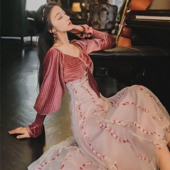 パーティードレス ワンピース ドレス 結婚式 お呼ばれ 切り替え ミモレ丈 長袖 秋 冬 二次会 演奏会 ボリューム袖 レトロ ベルベット 大人可愛い 10代 20代 個性的 花柄 紫 おしゃれ
