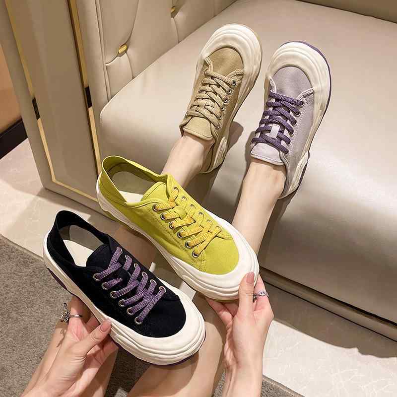 スニーカー レディース キャンバス シューズ 淡色 可愛い 帆布 運動靴 厚底 韓国系 紫 パープル 黒 ブラック ベージュ 無地 個性的 ナチュラル 春夏 ラウンドトゥ ローカット バイカラ 厚底靴