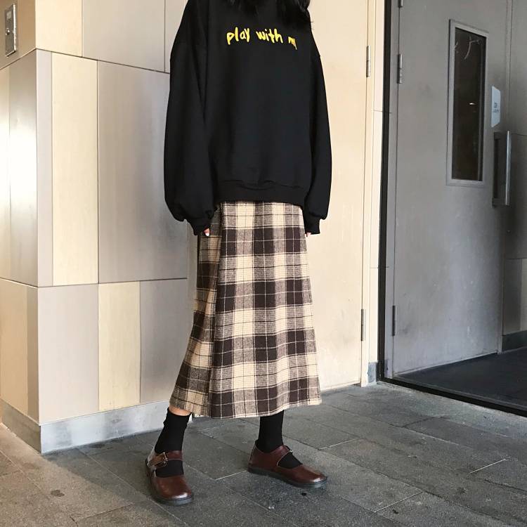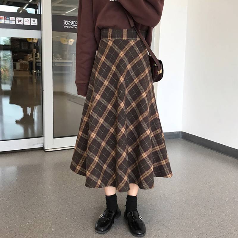 チェックスカート ロングスカート フレアスカート スカート ボトムス レディース 秋冬 ハイウエスト Aライン ロング ミモレ丈 格子縞 チェック柄 ブラウン フレア カジュアル レトロ 可 きれいめ