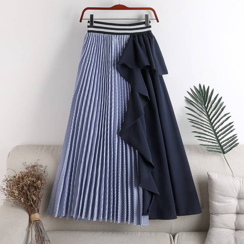 2色 スカート レディース プリーツスカート ミディアム丈 膝下 ロングスカート フリル Aライン おしゃれ 大人可愛い きれいめ 個性的 エレガント 上品 高級感 華やか ブルー ブラッ フェミニン