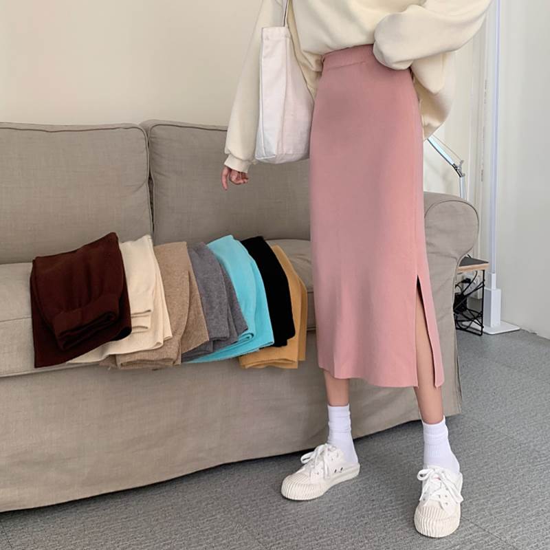 ニットスカート Iライン タイト ロング かっこいい 大胆 スリット カジュアル ミモレ丈 スカート ボトムス レディース 春 秋 冬 ハイウエスト 大人可愛い オルチャン ファッション 着回し 韓国