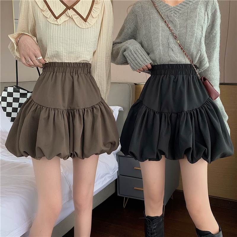2色 ミニスカート ギャザー バルーン スカート ボトムス 黒 茶色 かわいい ガーリー ミニ丈 ブラウン ブラック ショート丈 ラブリー キュート 個性的 スタイルアップ ハイウエスト Aライ 韓国